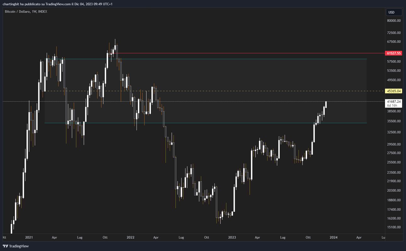 Il ritracciamento che mi aspettavo la settimana scorsa non è avvenuto, Bitcoin è riuscito a chiudere la settima candela settimanale bullish di fila spazzando via tutta la price action laterale che si protraeva da un mesetto, dimostrando dunque estrema forza e adottando un comportamento tipico di un bull market.