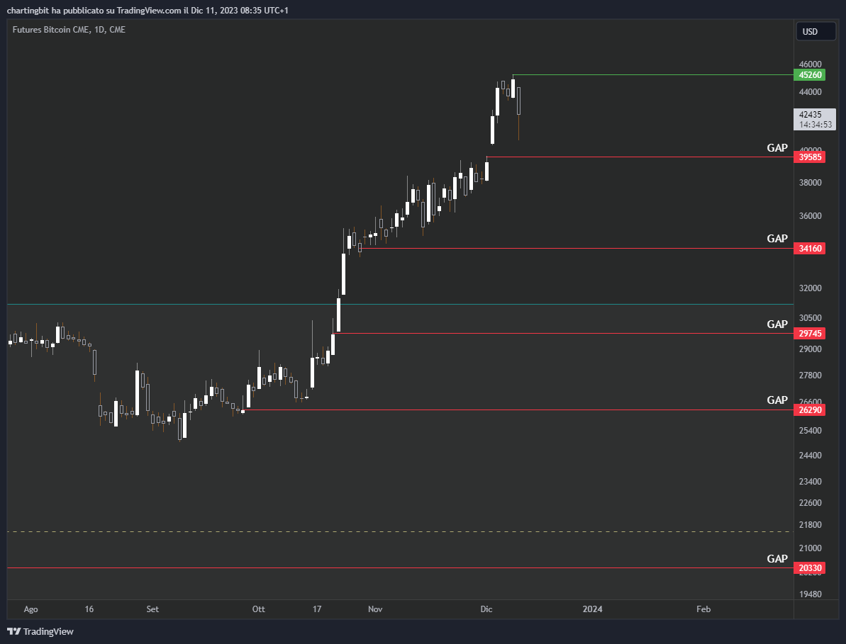 Infatti Bitcoin per il momento ha arrestato la sua corsa intorno ai 45 mila dollari, nel BTC1! (CME chart) ha toccato i $45260.