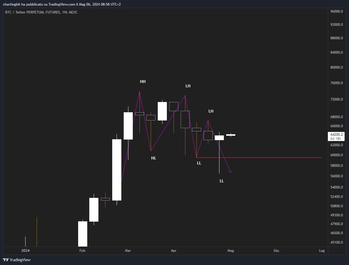 Nel caso specifico di Bitcoin, nel settimanale era piuttosto chiaro individuare la struttura del prezzo e capire che eravamo a rischio di rottura del trend bullish.