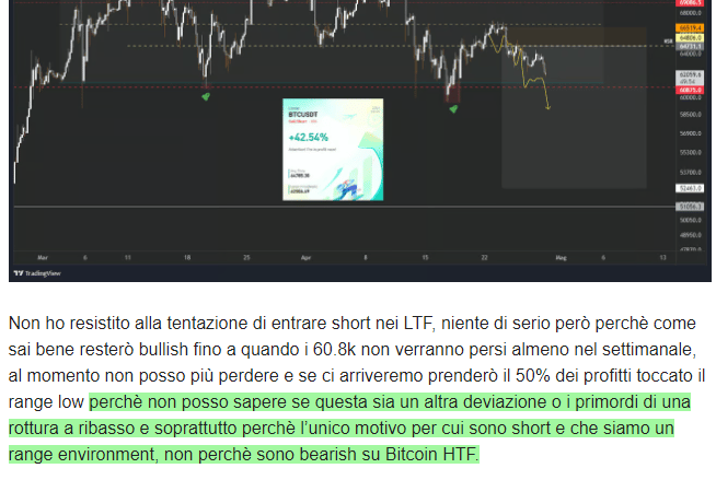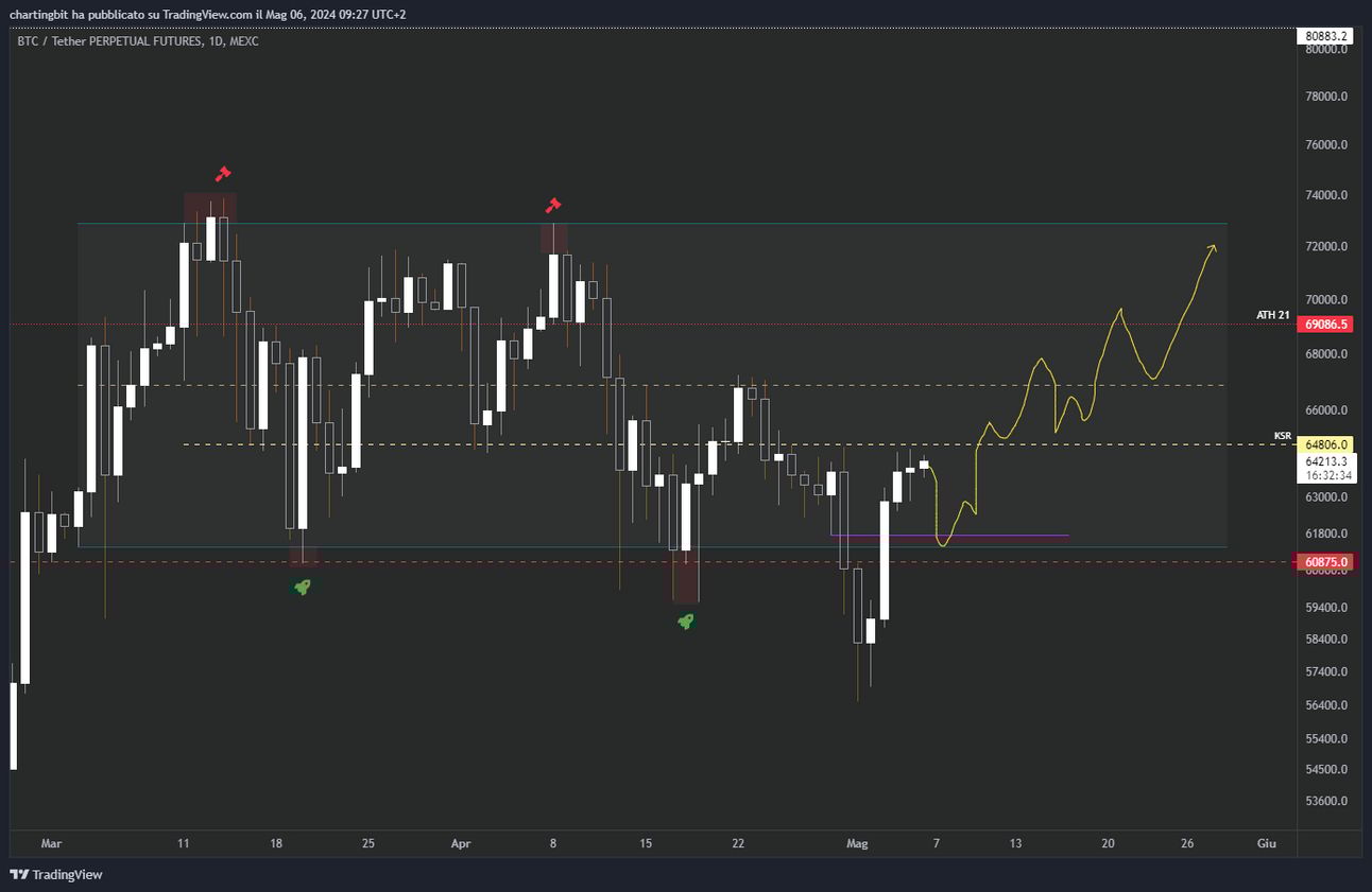 Quanto alla situazione attuale di Bitcoin manca ancora una conferma per poter chiamare un ritorno ad ATH ed oltre, che comunque rimane la possibilità più probabile visto il recupero che è avvenuto, ma BTC è ancora in un bear trend nel giornaliero, quado tornerà sopra i 67k (che è anche il mid range di cui ti ho parlato negli scorsi riepiloghi) allora avremo la conferma di cui ti parlo.