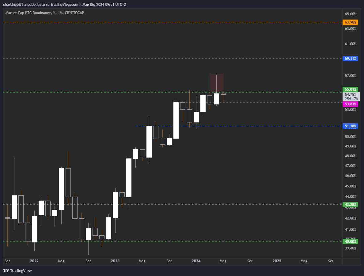 Potremmo essere vicini alla tanto agognata alt-season, la mensile di aprile sulla BTC.D ha chiuso sotto il mio livello di resistenza più importante al 55% con un ombra piuttosto estesa, tuttavia il trend HTF rimane bullish e pertanto mi tocca seguirlo, per poter considerare molto probabile una rottura (quindi l’inizio di un effettiva alt-season) vorrei prima vedere almeno perso il livello al 53.83%.