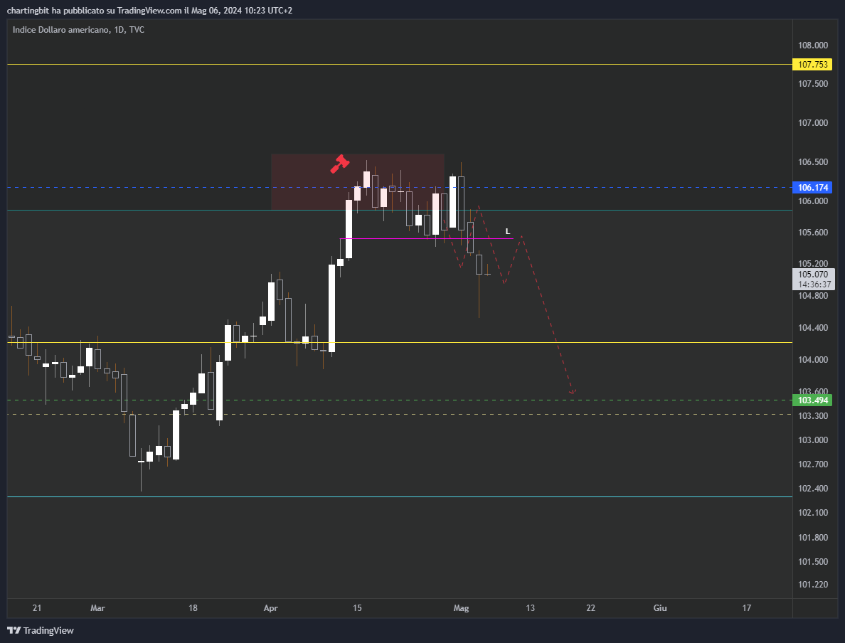 Mi aspetto almeno un ritorno al mid range, intorno ai 103.5, poi sarà interessante vedere se perderà anche quel livello, sarebbe davvero ottimo per le crypto: