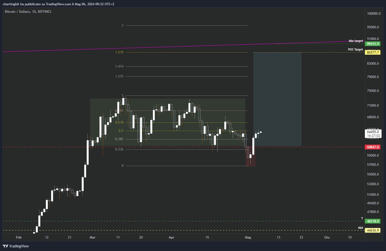 Questa sarebbe la conformazione ottimale in queste condizioni di mercato (se vuoi capire perchè leggi le mie due guide sui range), inoltre non nego che mi darebbe molta fiducia sulla possibilità che quello attuale sia un PO3 enorme, il cui target tra l’altro coincide quasi con i 90k, che come sai sono il mio prezzo target fino a quando BTC rimane bullish nel settimanale: