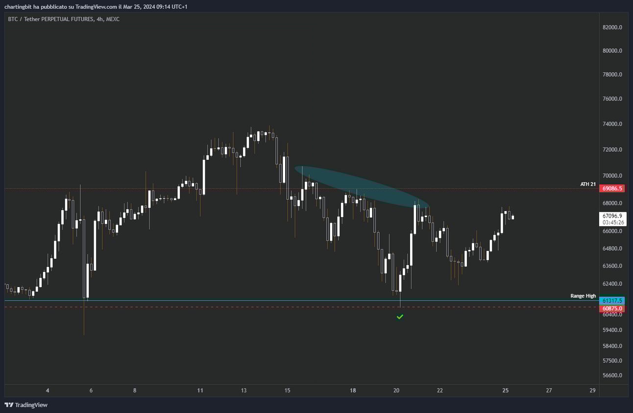 Ora è il momento della verità, infatti Bitcoin deve dimostrare che questo ribasso era solo un retest e confermare l’effettiva uscita dal macro range che ti ho mostrato nello scorso riepilogo, per farlo come sai già deve riconquistare i 69k, al momento c’è abbastanza vicino ma non possiamo sapere se sta solo andando a pescare la liquidità degli short sino ai 71k (ellisse in blu) o se invece è diretto verso un nuovo ATH: