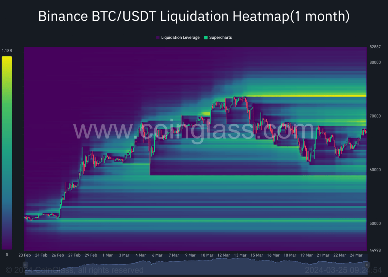 Dando uno sguardo alla Liquidation Heatmap poi puoi natare come i 71k non siano il livello più importante, infatti proprio a ridosso dell’ATH a 74k abbiamo la maggioranza delle liquidazioni degli short accumulati fino ad ora, valore che è il più alto in assoluto fino almeno ai 45k…