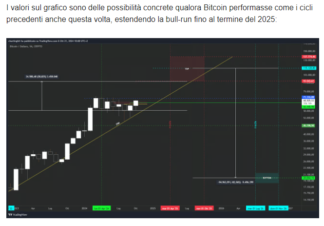 Tuttavia oggi vorrei aggiungere altri dettagli a riguardo, infatti la settimana scorsa ragionando sui risultati passati di Bitcoin in riferimento alle elezioni Americane e su varie considerazioni tecniche fatte in questi mesi, ho ottenuto una confluenza importante con un livello di prezzo piuttosto elevato ma comunque realistico qualora anche questa bull-run dovesse essere prepotente e prolungata quanto le precedenti: