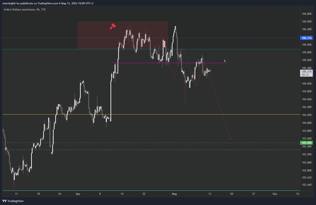 Il dollaro si sta comportando alla perfezione, ha ritestato il mio liquidity level (in viola “L”) e mi aspetto che crolli fino a 104.2 e 103.5 come ti ho già detto negli scorsi riepiloghi, la deviazione sopra il range high è stata dunque confermata: