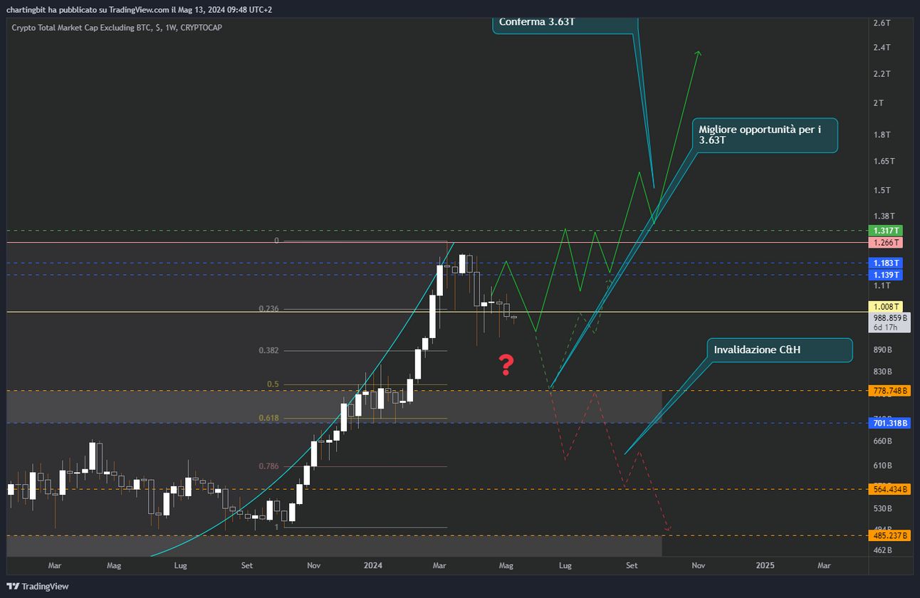 Ma anche se avessi ragione non c’è da disperare, ne ho già parlato in vari riepiloghi, anche se tornassimo a 778B potrebbe essere un’opportunità più che ottima per reinvestire in altcoin, il motivo l’ho già spiegato qui e riguarda il possibile C&H con target a 3.63T, non male se dovesse davvero verificarsi, anzi, al momento si tratta della possibilità migliore in assoluto (dal punto di vista del rapporto rischio beneficio) e il prezzo sembra stia iniziando a seguirla (linea verde tratteggiata)