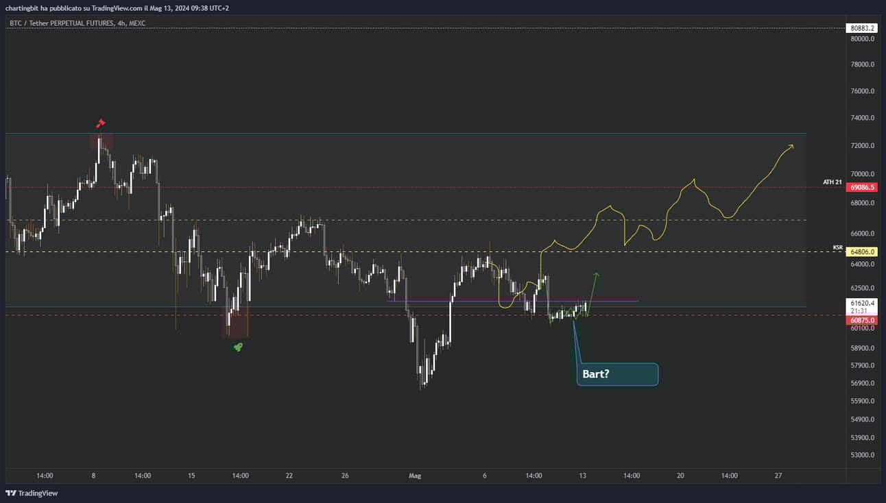 Come ti avevo detto anche la scorsa settimana dunque credo che ci attenda un rialzo, al momento non posso sapere dove eventualmente terminerà ma fino a quando la deviazione a 56.5k non verrà riassorbita sarò convinto che il prezzo si muoverà a rialzo, almeno fino ai 73k, poi vedremo.
