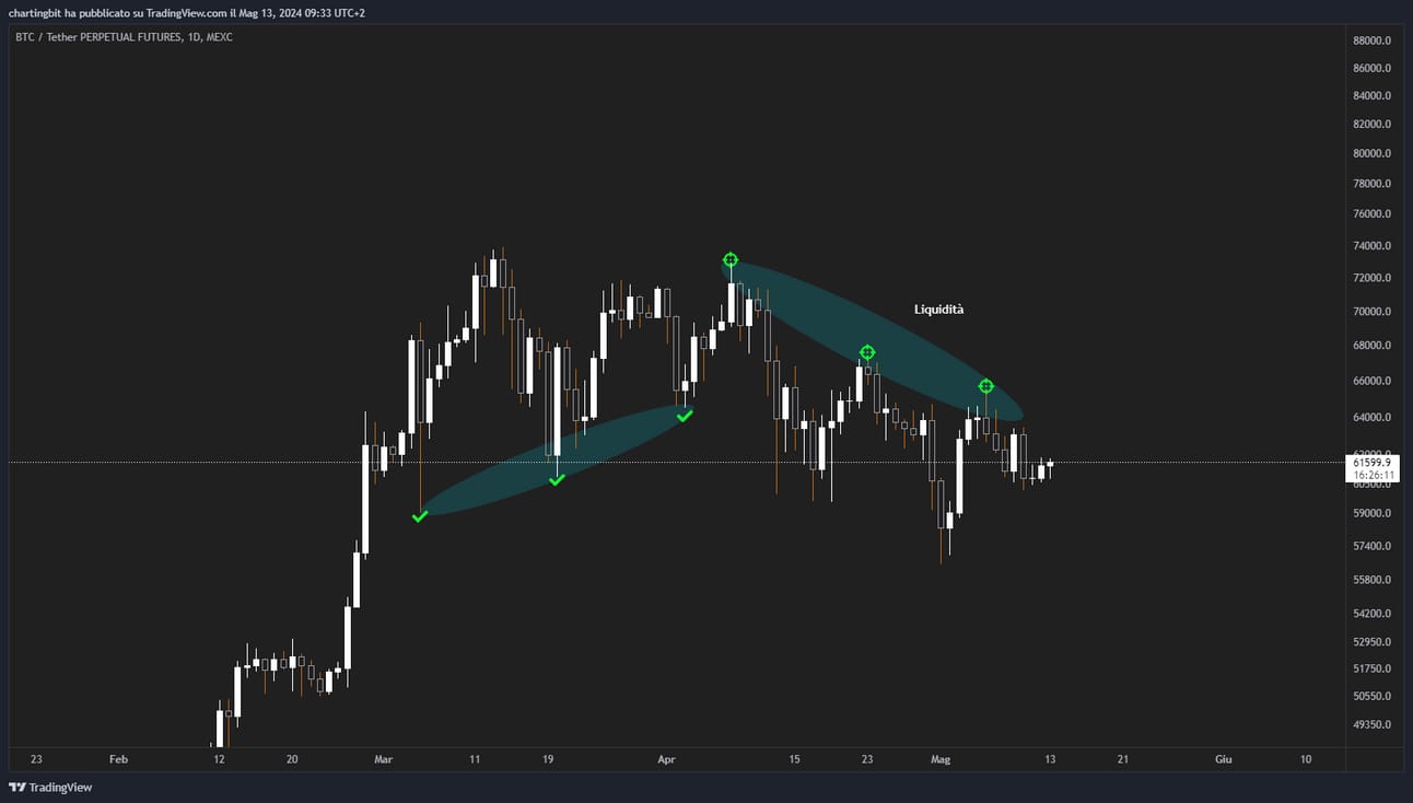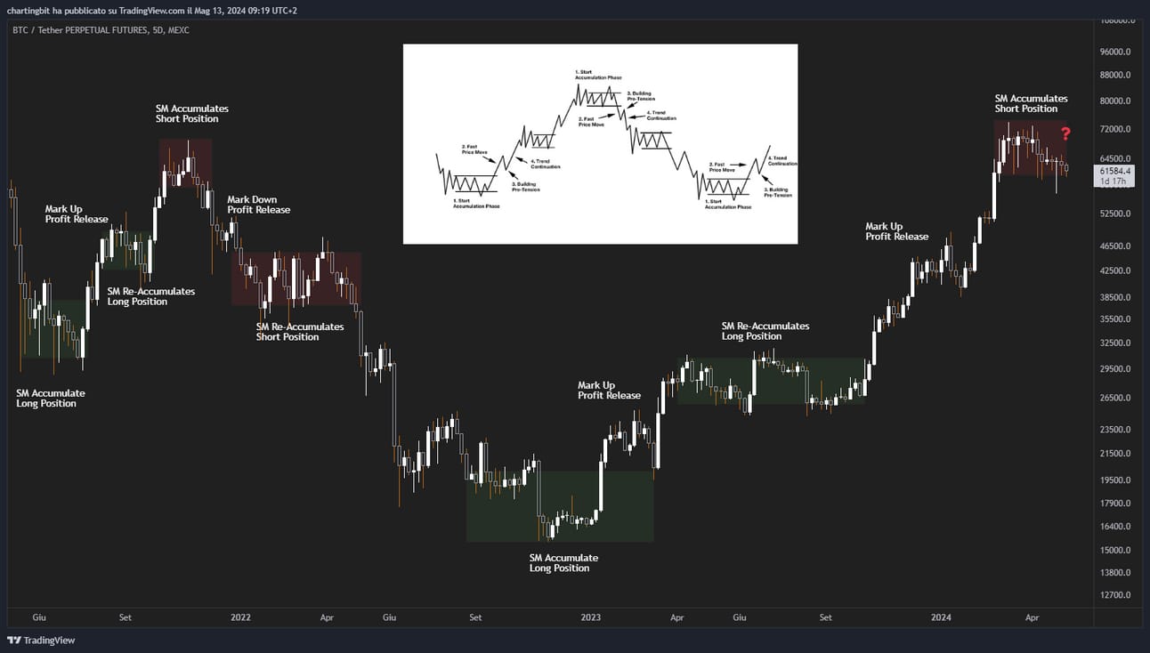 Non possiamo sapere con certezza se quella attuale sia una distribuzione, ovvero se gli smart money (SM) stiano prendendo profitto e costruendo posizioni short, la probabilità è alta visto che abbiamo già avuto le due canoniche fasi di accumulazione e i due rialzi.