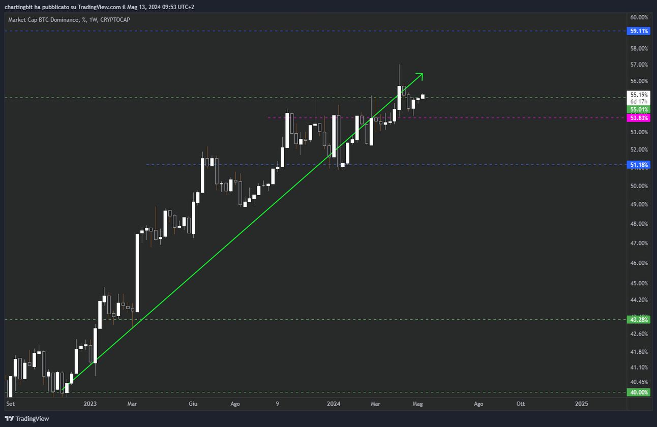 Questo potrebbe anche essere il segno di una possibile alt-season alle porte, tuttavia è prematuro dirlo ed al momento non se ne parla proprio, Bitcoin è ancora al centro dell’attenzione, infatti la dominance si è riportata sopra i livello di resistenza più importante al 55% e per il momento non c’è alcun segno di una rottura del trend rialzista (quindi dell’inizio di un alt-season, ovvero un trend a ribasso nella BTC.D):