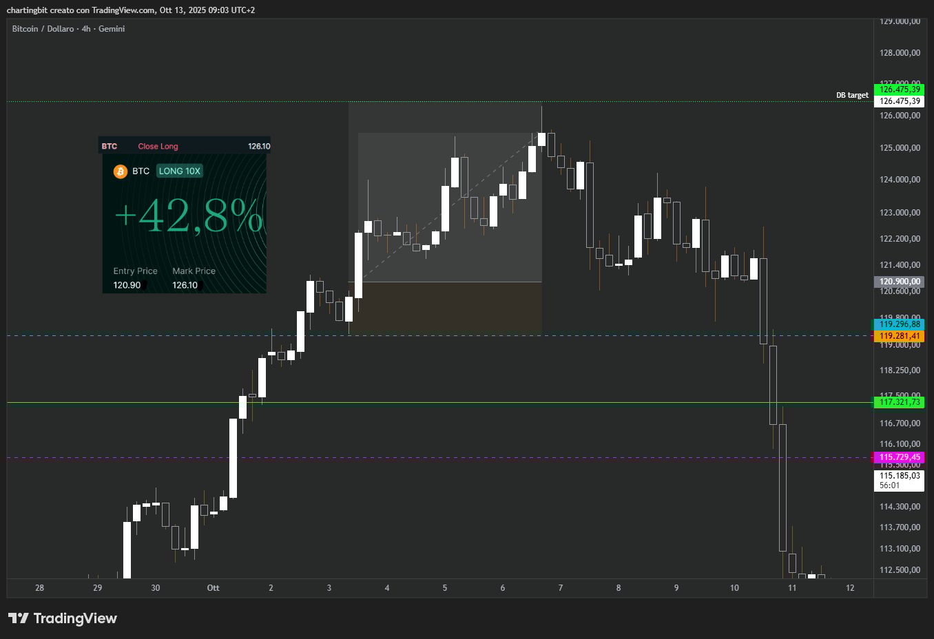 Lunedì scorso avevo indicato i 126.5k come il target del mio long, non ne ero particolarmente fiducioso perché il prezzo non mi stava convincendo più di tanto, in ogni caso tale livello è stato raggiunto e ha anche rappresentato il TOP -per ora temporaneo- prima di questo crollo.