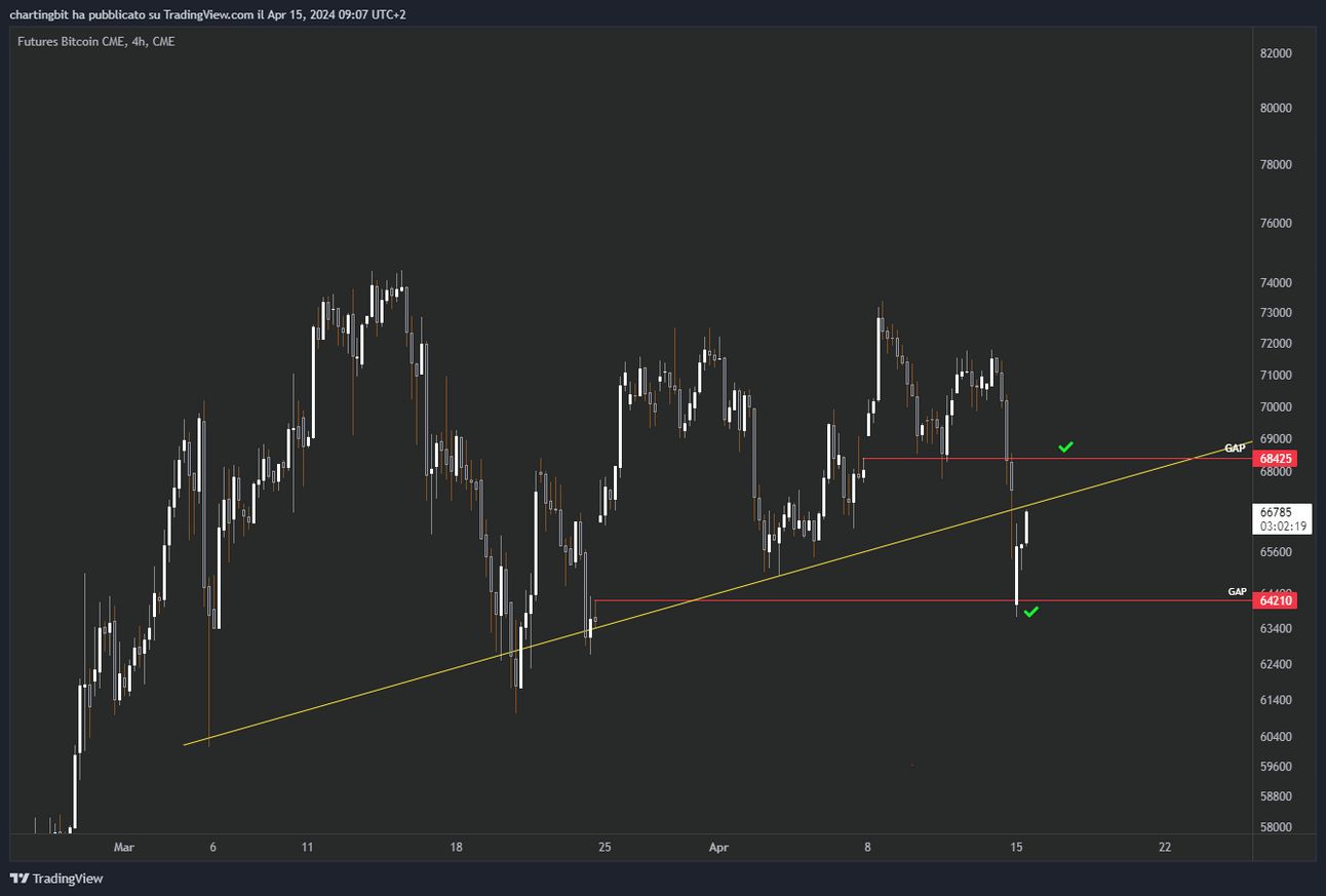 Sappiamo tutti che durante il fine settimana molti partecipanti hanno agito d’impulso alla notizia del fantomatico attacco dell'Iran (fantomatico perchè poche oro dopo lo spazio aereo era già tornato a disposizione di tutti…), tuttavia, come avevo anticipato nello scorso riepilogo, BTC sul CME aveva lasciato ben due GAP aperti ed avevo espresso le mie perplessità su un immediato ritorno oltre i 74k prendendo quindi una parte dei profitti del mio long, la cui restante parte infatti è stata distrutto sabato e i CME GAP citati tutti sono sta chiusi: