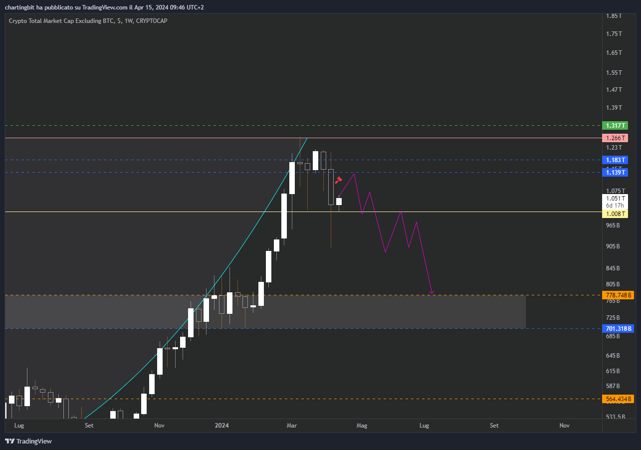 In ogni caso, le alt sono ancora sedute sopra 1T ma hanno perso il supporto più importante a 1.13T, se dovessero chiudere una bi-settimanale sotto 1T per le alt si metterebbe molto molto male, tuttavia se recuperassero 1.18T allora il discorso cambierebbe e tornerei bullish: