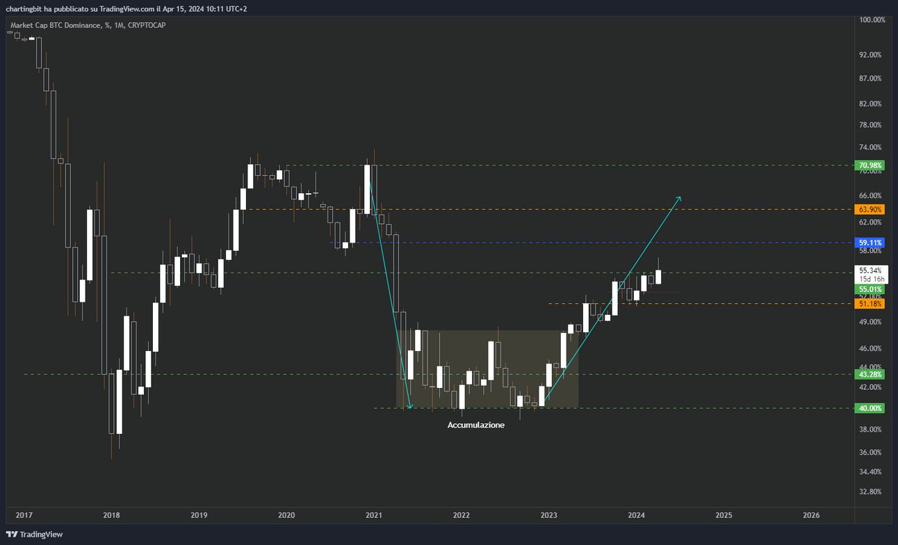 Se dovesse chiudere aprile sopra i 55% i 59 ed anche i 64 sarebbero sul tavolo, cosa che tanti potrebbero considerare folle ma si tratterebbe solo di in ritorno ai livelli di bilanciamento tra btc ed alt normali prima della folle alt-season che abbiamo avuto nel 2021, te lo mostro sul grafico: