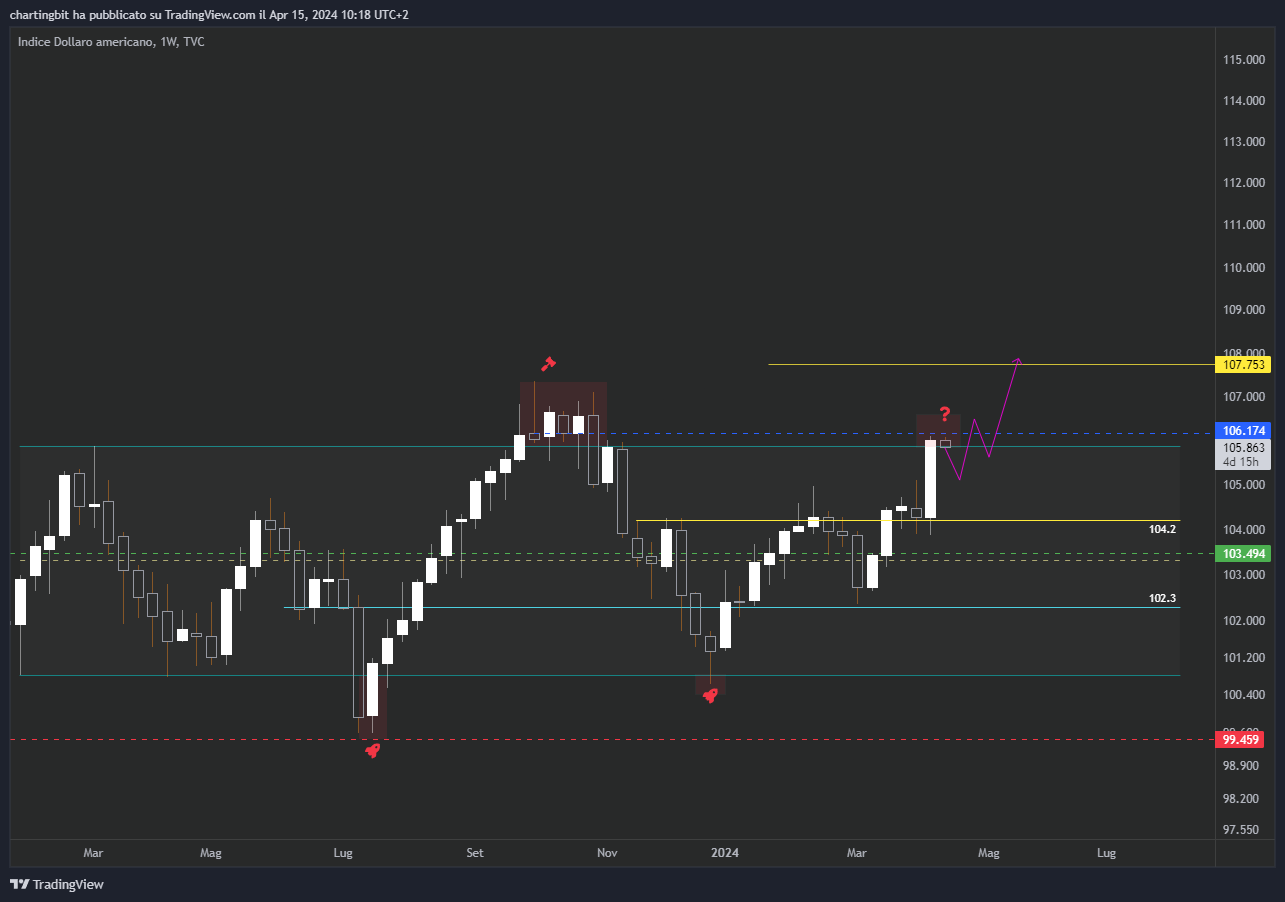 Come anticipato, il mio target parziale a 106.17 è stato raggiunto alla perfezione, inoltre una settimanale è stato chiusa sopra il range high, non necessariamente un segno bullish (potrebbe ancora essere un ennesima deviazione) ma certamente qualcosa cui prestare attenzione, se infatti il DXY avrà la forza di rompere i 106.17 il target finale a 107.75 sarebbe molto probabile e con esso una continuazione a ribasso su tutti i mercati (ritracciamento del wick su BTC fino a 60.8k)