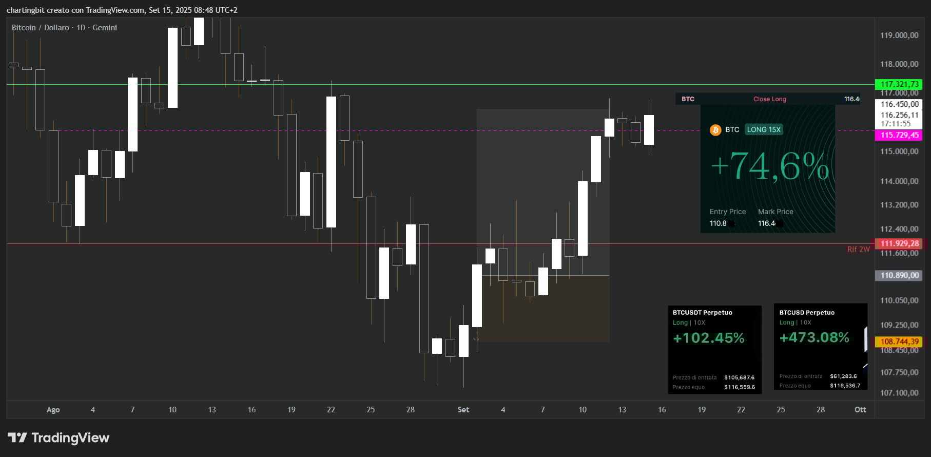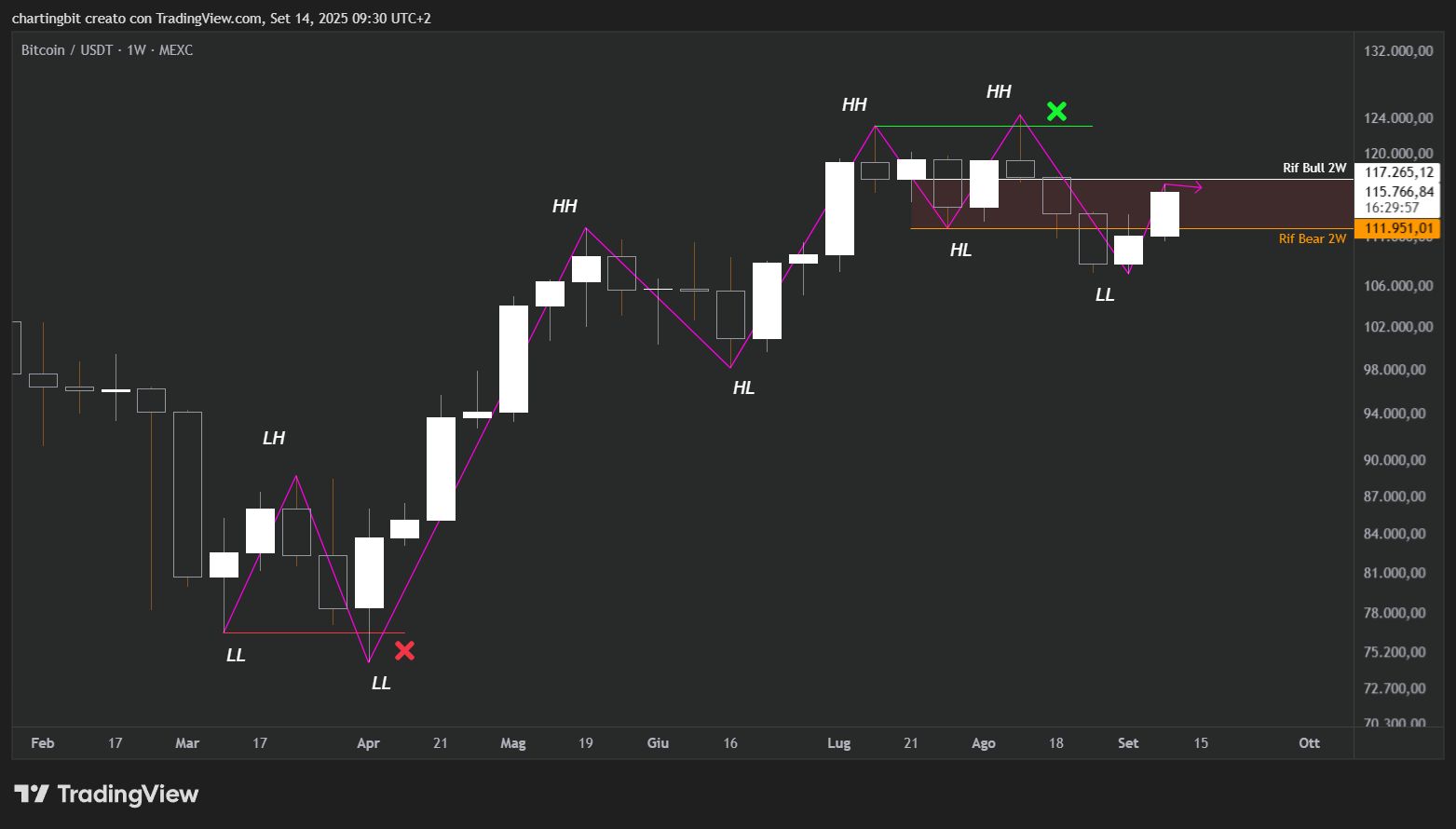 Il perché l’ho già dettagliato per tempo nelle ultime settimane, ed in particolare nell’ analisi del primo settembre, i 117k, come sai, sono infatti importanti non solo a causa del GAP ormai chiuso ma soprattutto del riferimento bullish nel grafico bi-settimanale.