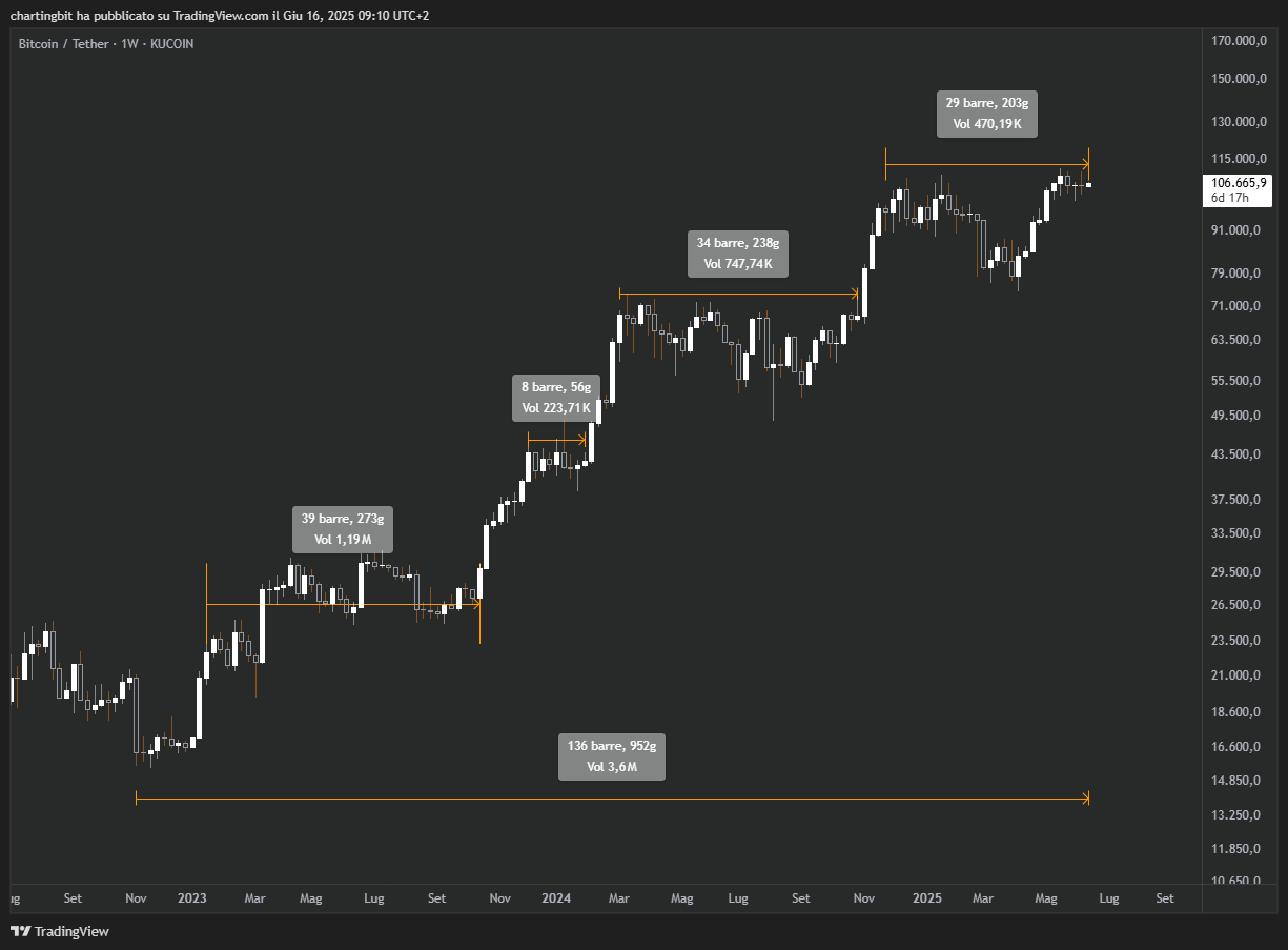 Continua la solita solfa di noiosi e lunghi temporeggiamenti da parte della price action di Bitcoin, che a conti fatti dal 2023 ad oggi ha passato ben 770 giorni su 952 a lateralizzare e stremare la nostra pazienza, ovvero l’81% del tempo…