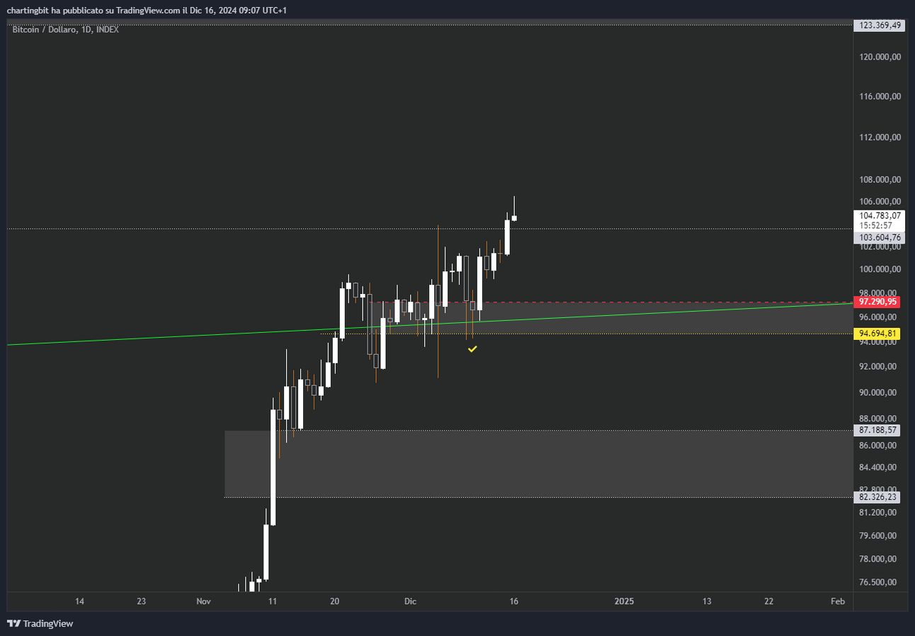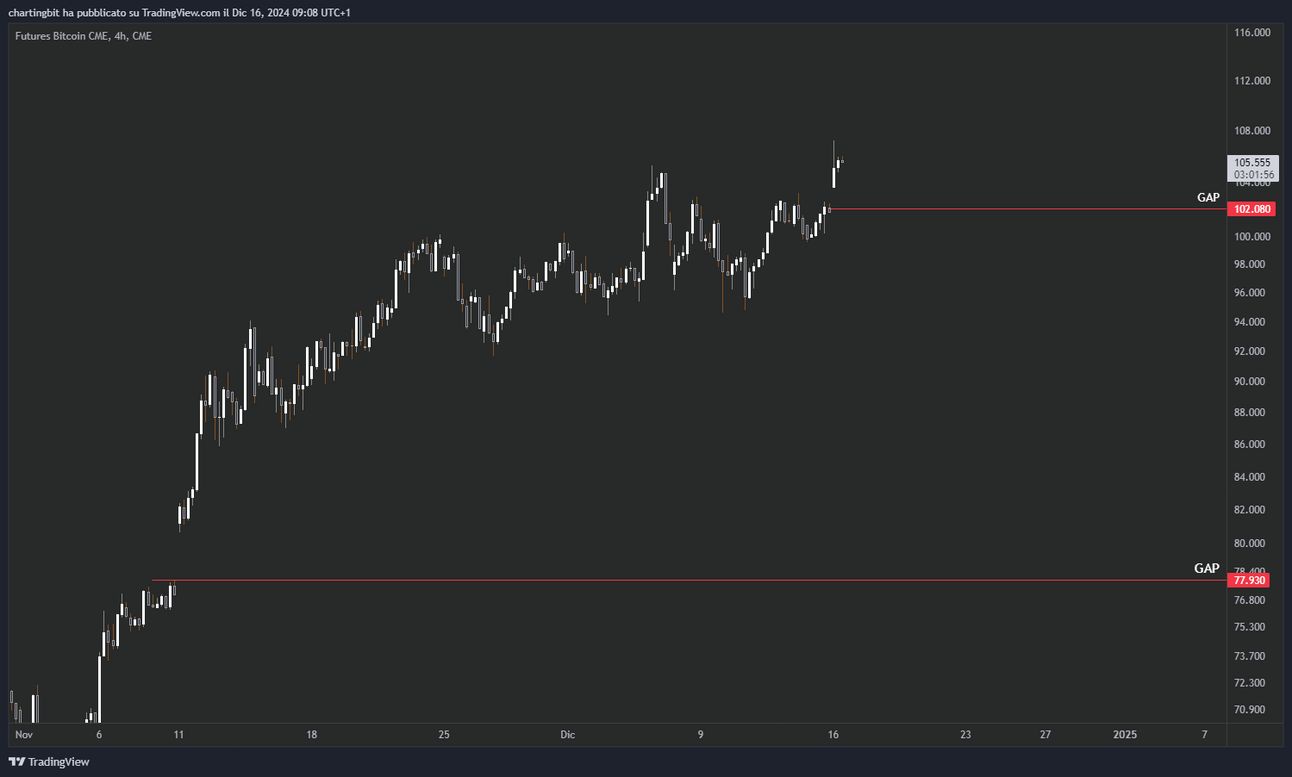 Bitcoin è anche andato ad ATH, lasciandosi tuttavia un bel GAP a circa 102.08k, niente di problematico in quanto al momento siamo molto vicini ed anche se Bitcoin lo chiudesse non sarebbe in alcun modo un indice di ulteriori ribassi, certo, sarebbe preferibile se non si formassero GAP, ma come sai in bull market questo conta molto meno rispetto ai periodi di range: