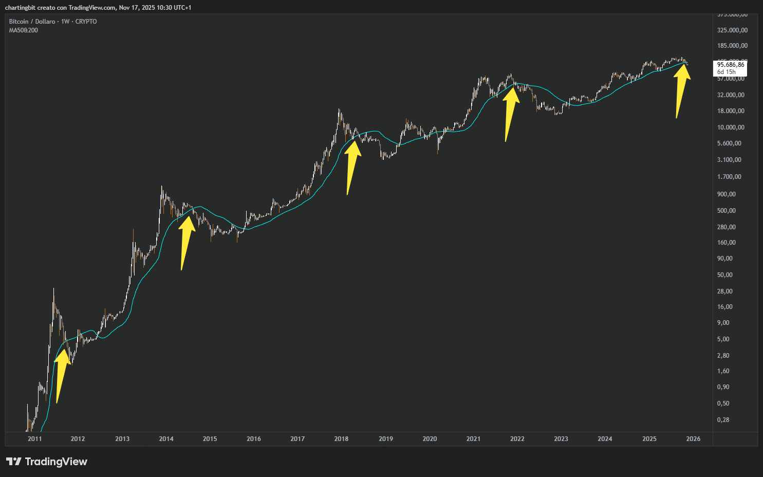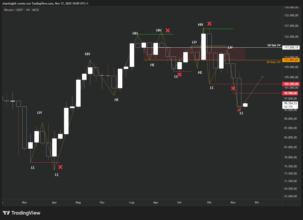 Come dichiarato il 13 ottobre, il riferimento chiave per la conferma di ritorno in bear trend settimanale (ergo in bear market), erano i 102.5k, livello che è stato prima “rovinato” dall’ombra della scorsa candela settimanale (che non è riuscita a chiudere al di sotto), e poi invece riconfermato insieme al nuovo lower low a 99k con la chiusura settimanale di stanotte, che senza alcun dubbio sulla conformazione ha definitivamente confermato che Bitcoin si trova di fatto in un bear trend settimanale: