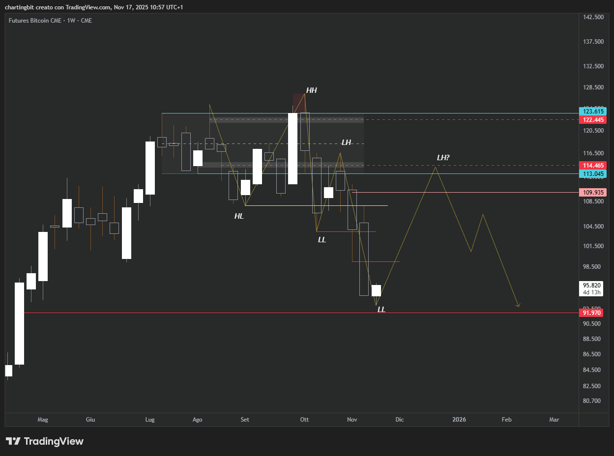Bitcoin, dopo aver chiuso il GAP a 91.9K o meno (più probabile dopo averlo chiuso), si dirige verso il micro GAP a 110k e poi invalida il neo bear trend chiudendo una settimanale sopra il lower high di riferimento attuale situato a 116.4k e verosimilmente anche una bi-settimanale oltre il nuovo riferimento nello stesso time frame situato a 114.6k
