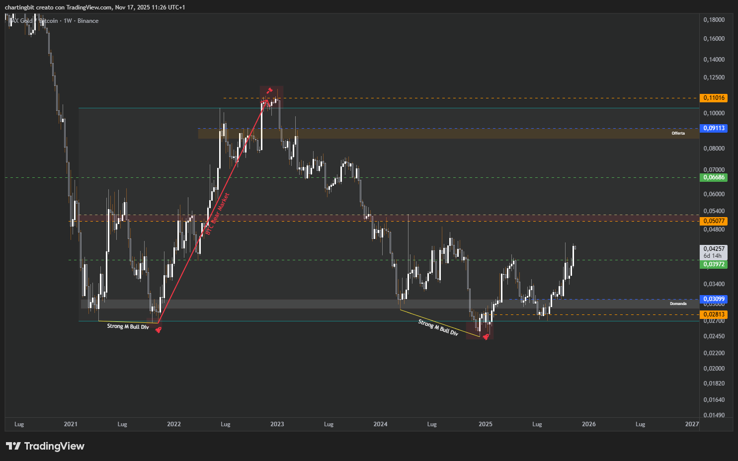 Ancora, anche il paragone con l’oro sta segnalando la stessa cosa, da tempo orami come ti faccio notare da settimane, ma soprattutto stanotte dopo che la settimanale ha chiuso oltre il livello di offerta più importante a 0.03972, che come sai era il mio riferimento ultimo per la conferma di un bear market su Bitcoin: