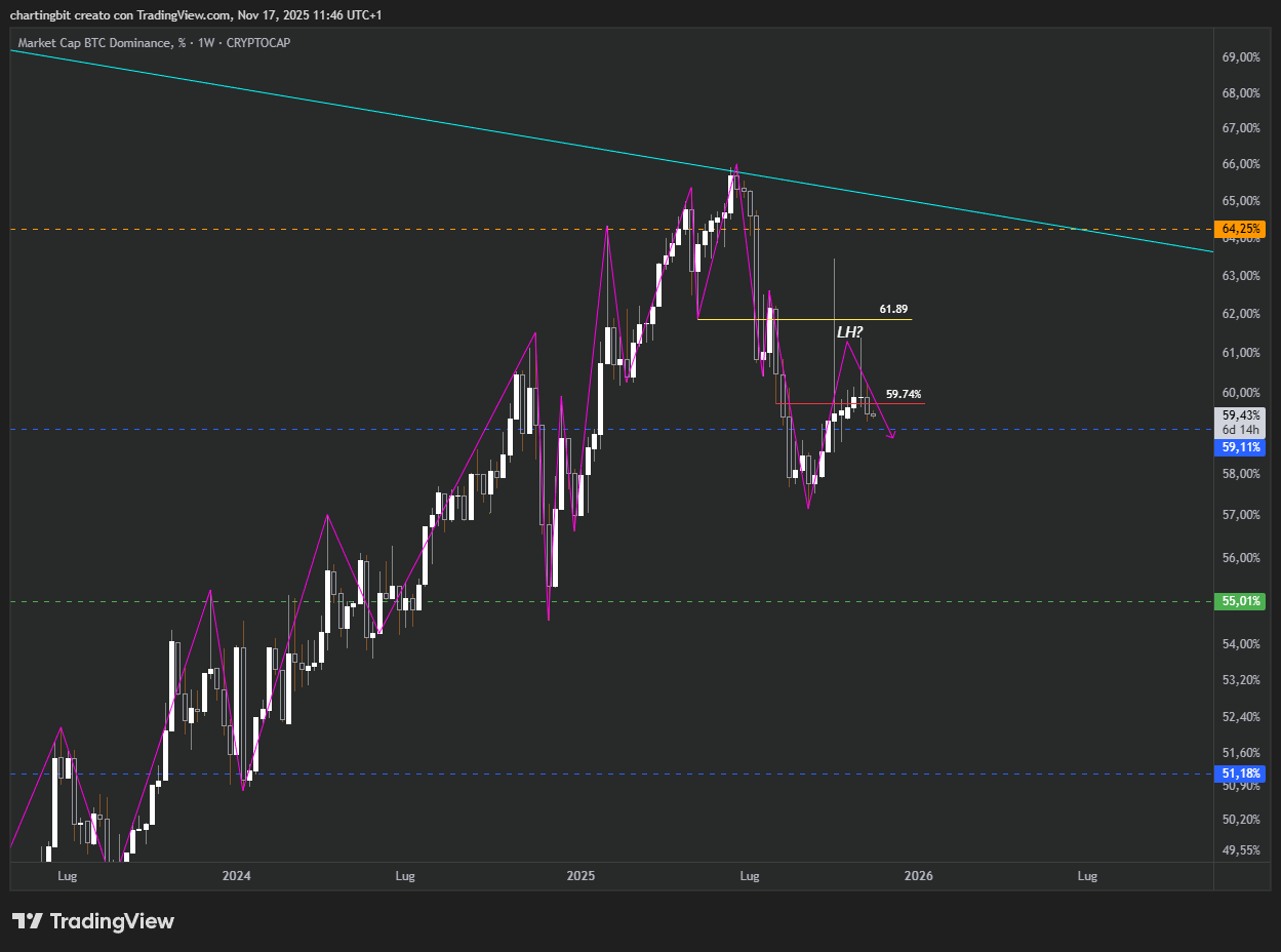 Detto questo, sia perché reputo altamente probabile un dead cat bounce, sia perché non posso dare per certo che Bitcoin non invalidi il neo bear trend, e sia perché la BTC.D in questi giorni ha continuato a calare portandosi sempre più vicina al mio livello decisivo del 59.11%; non è ancora detta l’ultima parola, almeno per quanto riguarda il mini rally discusso la scorsa settimana.