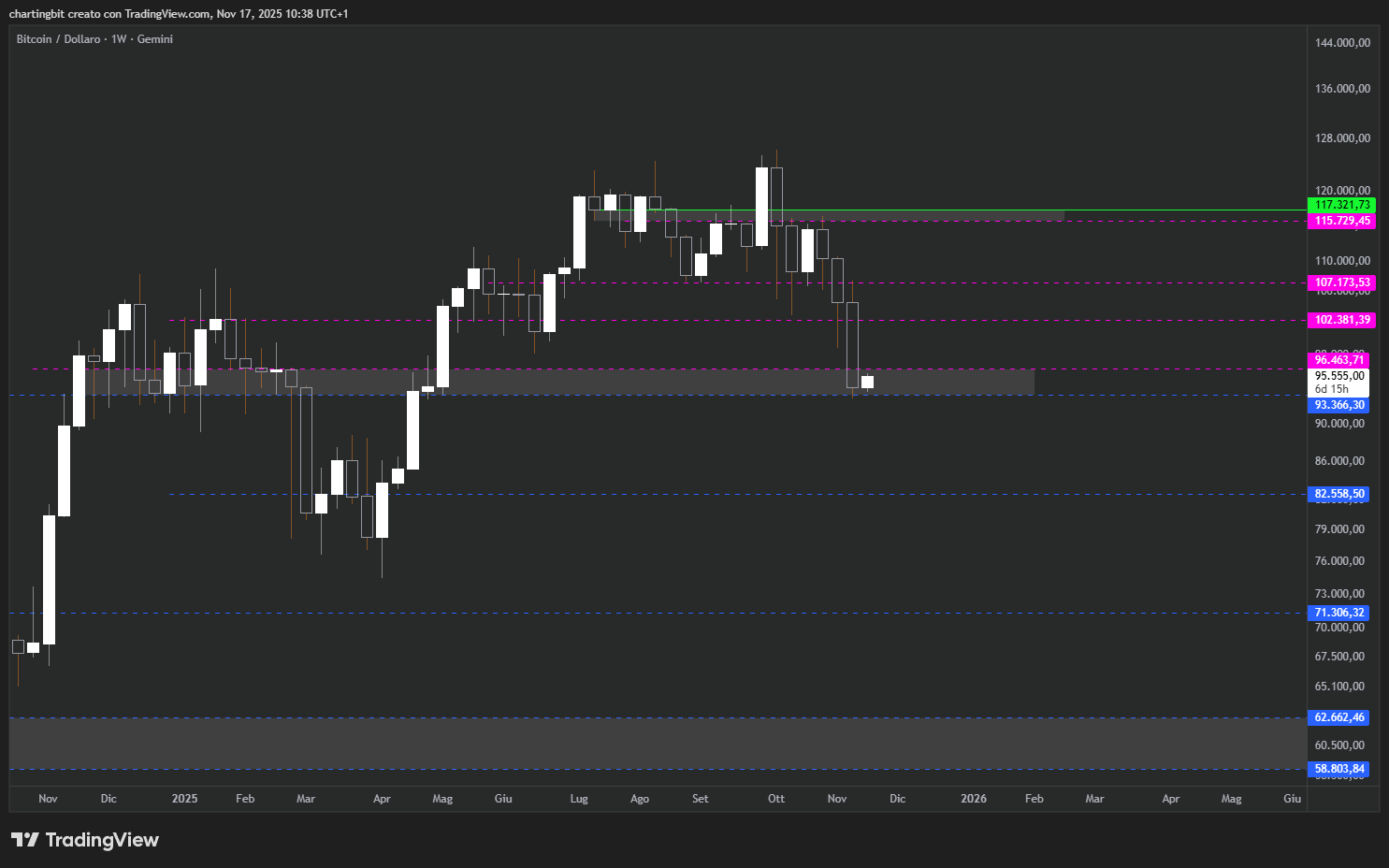 Ora, pur considerando tutti gli indici bearish appena descritti e ribadendo che sono i più importanti, c’è innanzitutto da dire che Bitcoin è ancora sopra il supporto chiave dei 93.4k, e che finché non lo perde dal settimanale in su una continuazione bearish è improbabile: