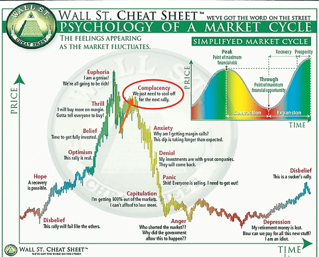 Ora come ora Bitcoin ha appena confermato il ritorno in bear market in molteplici modi, ergo in termini probabilistici è corretto puntare su ulteriori ribassi piuttosto che su nuovi ATH, tuttavia come ti ho già detto l’imprevedibilità esiste, come d’altronde esistono i “dead cat bounce” durante un bear market e in particolar modo il primo in assoluto che da vita alla fase di “Complacency”