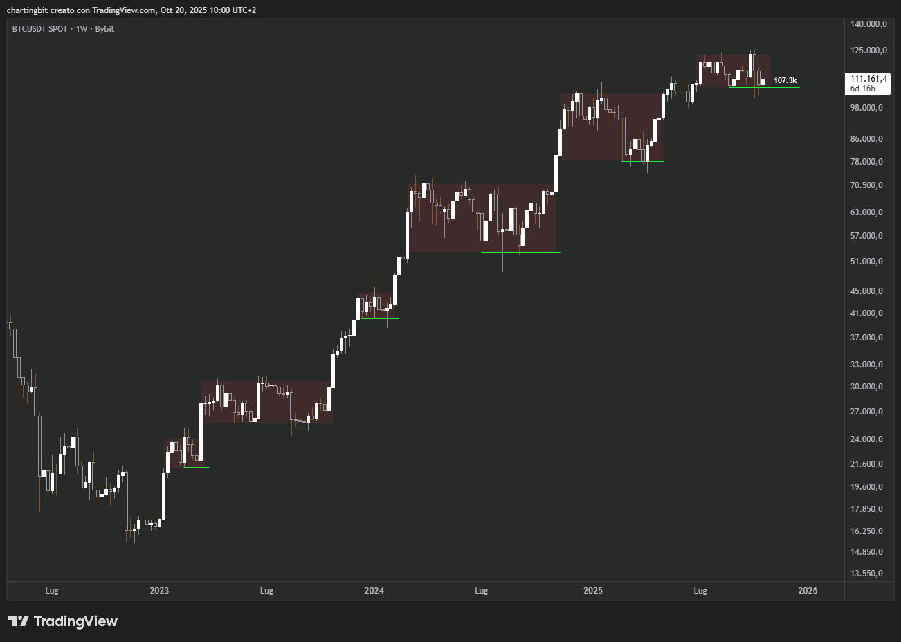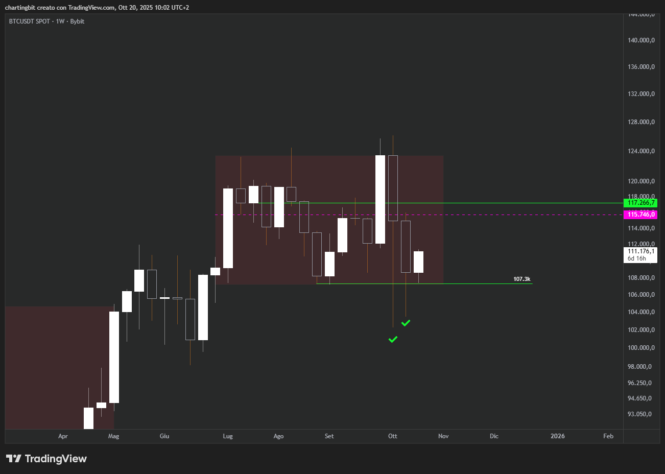 Per ora infatti ha reagito bene sotto il riferimento a 107.3k, tuttavia è ancora sotto la zona di offerta più importante situata tra 115.7 e 117.3k, che è il mio riferimento bullish principale per capire se Bitcoin ha davvero voglia di andare ancora una volta ad ATH o meno.