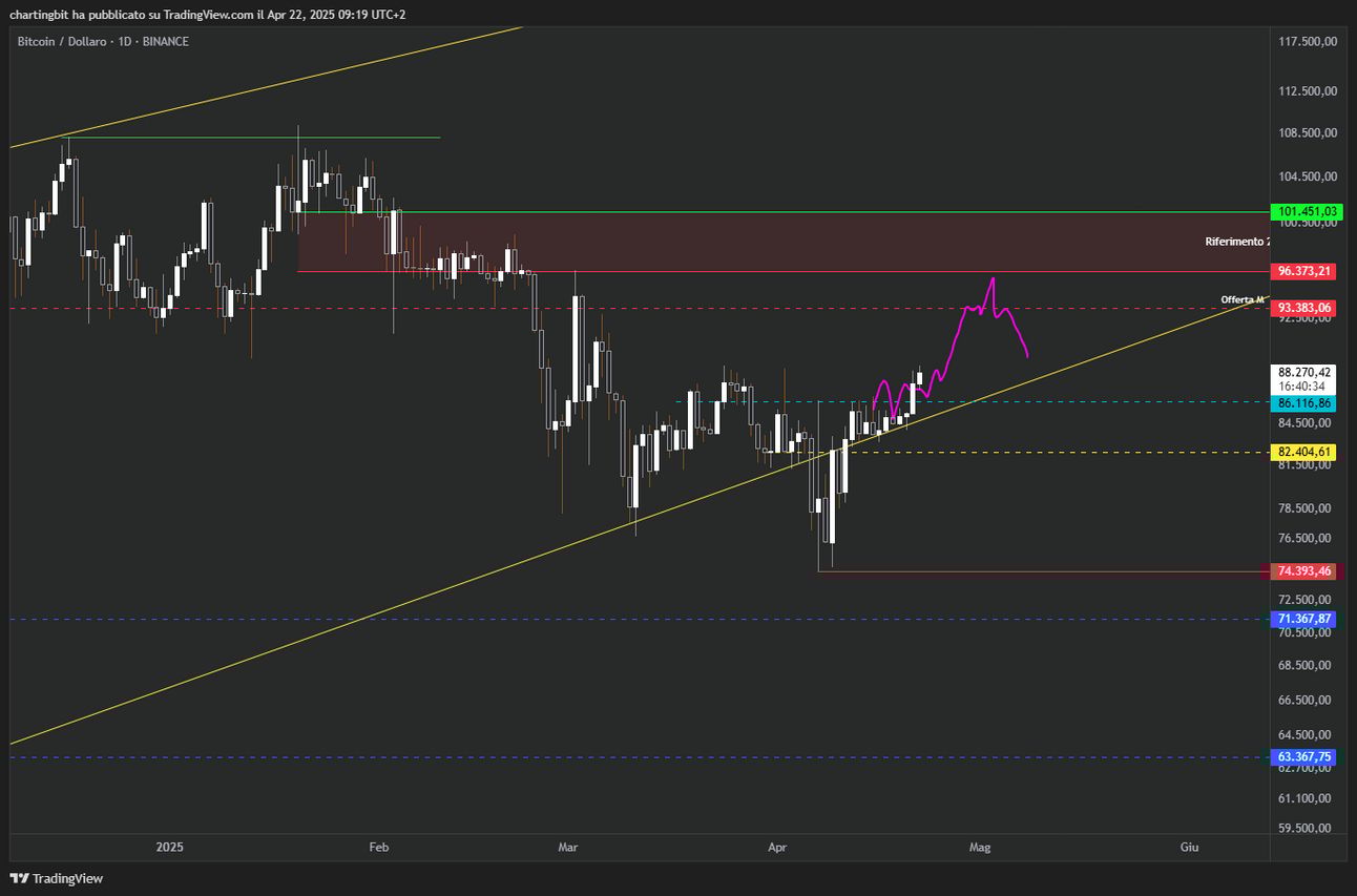 Al momento Bitcoin ha superato nel giornaliero il livello a 86.1k discusso la scorsa settimana, le considerazioni rimangono le stesse, ora come ora è più probabile un tocco dei 93.4k come minimo e anche dei 96.3k.