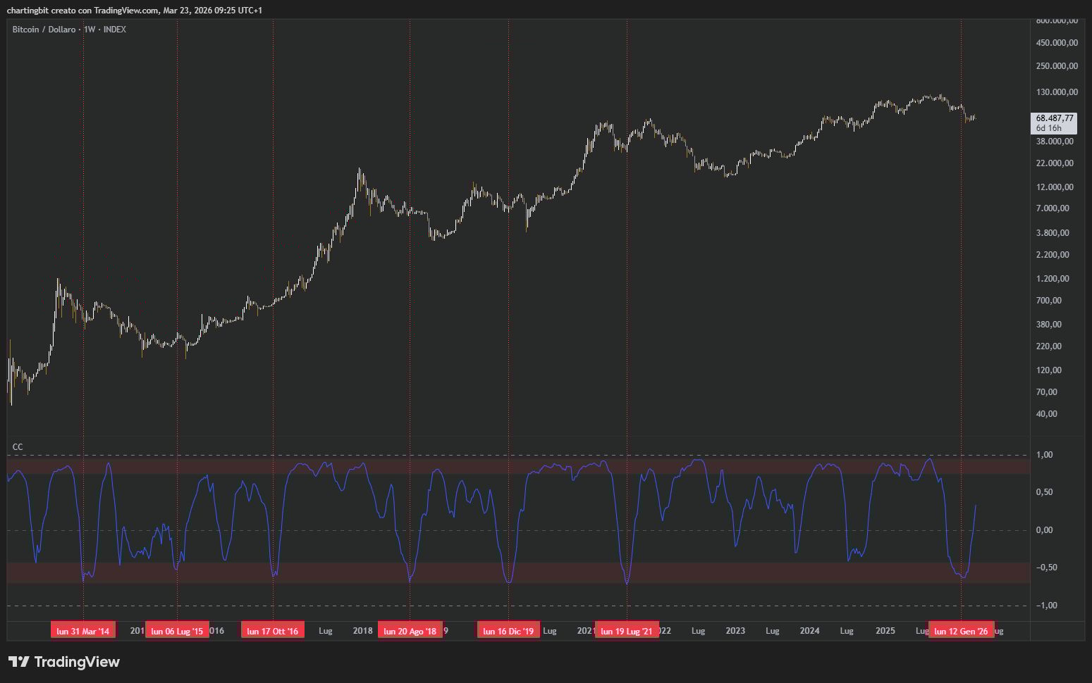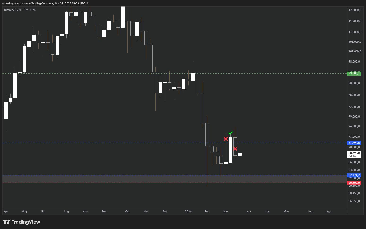 Nonostante abbia continuato a resistere piuttosto bene anche durante le ulteriori e pericolose escalation della guerra in Medio Oriente avvenute nell'ultima settimana, Bitcoin, per la seconda volta, ha fallito nel tentativo di superare concretamente il supporto fondamentale del 71.3k, riportando dunque le probabilità a favore di una continuazione a ribasso almeno fino ai 62.8k, ovvero tornando nell’esatta condizione in cui si trovava due settimane fa e ormai sin dai primi di febbraio:
