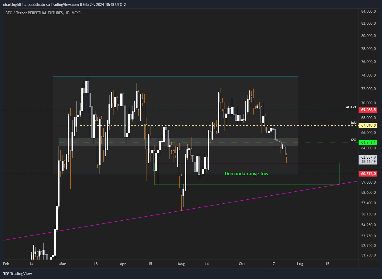 Niente da fare, dopo una settimana di vendita costante Bitcoin è ormai tornato alla zona di domanda del range low, che tra l’altro al momento non ha nemmeno scaturito una netta reazione a rialzo, questo mi fa credere che i 60.8k verranno ritestati a breve: