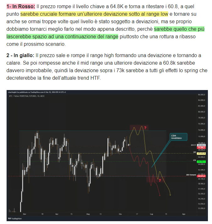 Ti ho riportato uno screen perchè quanto avevo scritto è ora di vitale importanza infatti se dovessimo raggiungere un altra volta i 60.8k, Bitcoin dovrà necessariamente rimbalzare o formare una deviazione sotto e tornare dentro al range, in caso contrario avrei già un doppio segnale di fine rialzo, quindi di exit totale dal mercato, ora ti spiego meglio: