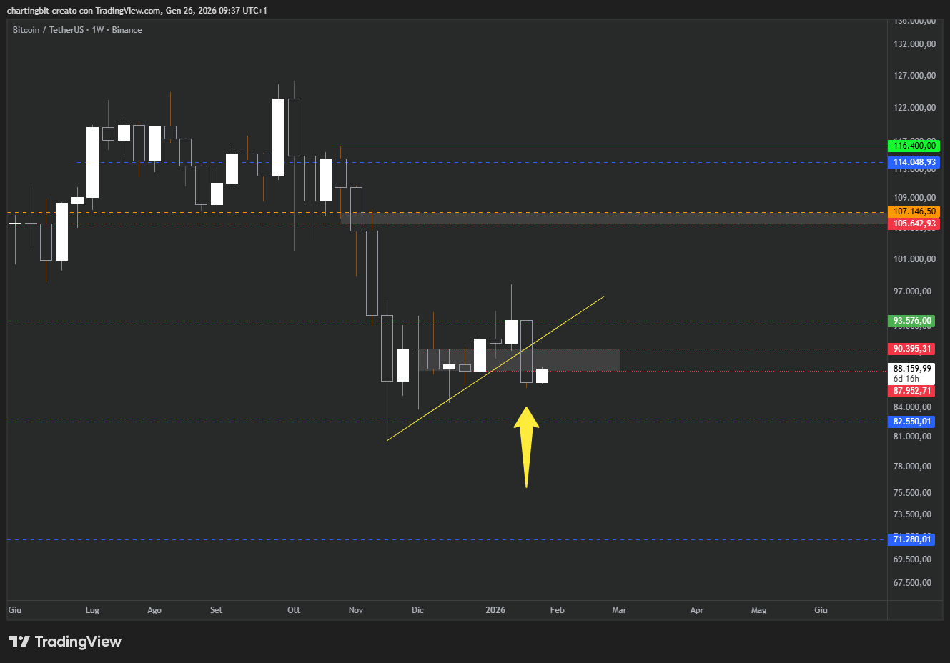 Il chiaro rifiuto della scorsa settimanale oltre i 93.1k, più il GAP lasciato aperto ad 88, non promettevano affatto bene, Bitcoin negli scorsi giorni ha infatti perso la domanda locale a 89.3k finendo inesorabilmente per ritestare quella a 86.4 e, soprattutto, per rompere a ribasso la lateralizzazione partita a novembre, di cui abbiamo parlato spesso nell’ultimo periodo.