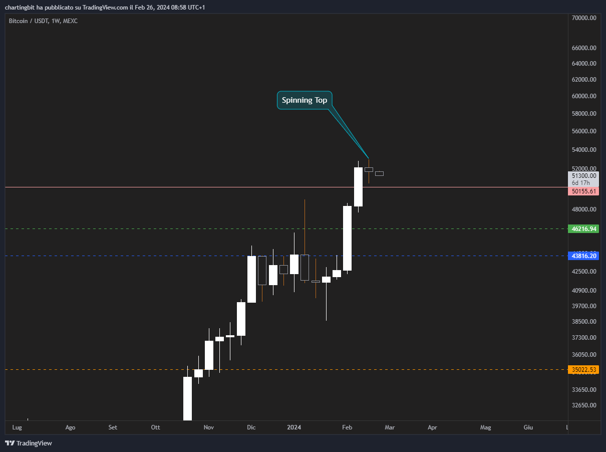 Questo è quanto vedo al momento per Bitcoin, l’attuale settimanale è stata l’ennesima spinning top che indica indecisione (lo stiamo vedendo con il micro range) ed il low corrisponde quasi con il livello a 50.1k, ergo una chiusura settimanale sotto mi inizierebbe a far drizzare le antenne per un eventuale rottura del trend bullish negli HTF, ma come sai già per il momento non tornerò bearish fino a quando BTC non perderà i 46.2k (se vuoi sapere perchè questo livello è così importante e soprattutto come li individuo trovi ogni informazione nel mio percorso).