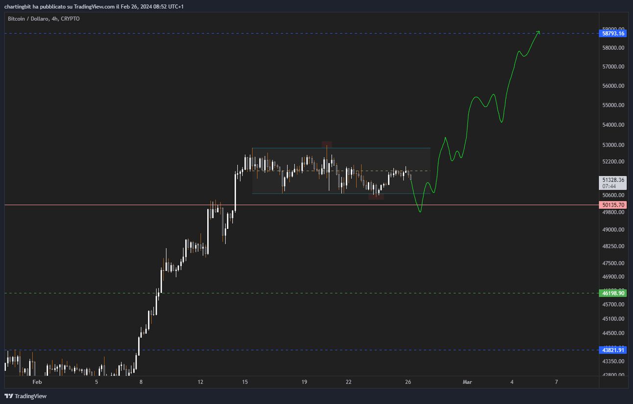 Poco è cambiato dalla scorsa settimana, Bitcoin è ancora sopra i 50.1k e al momento si trova confinato dentro un micro range che puoi vedere bene nelle 4H: