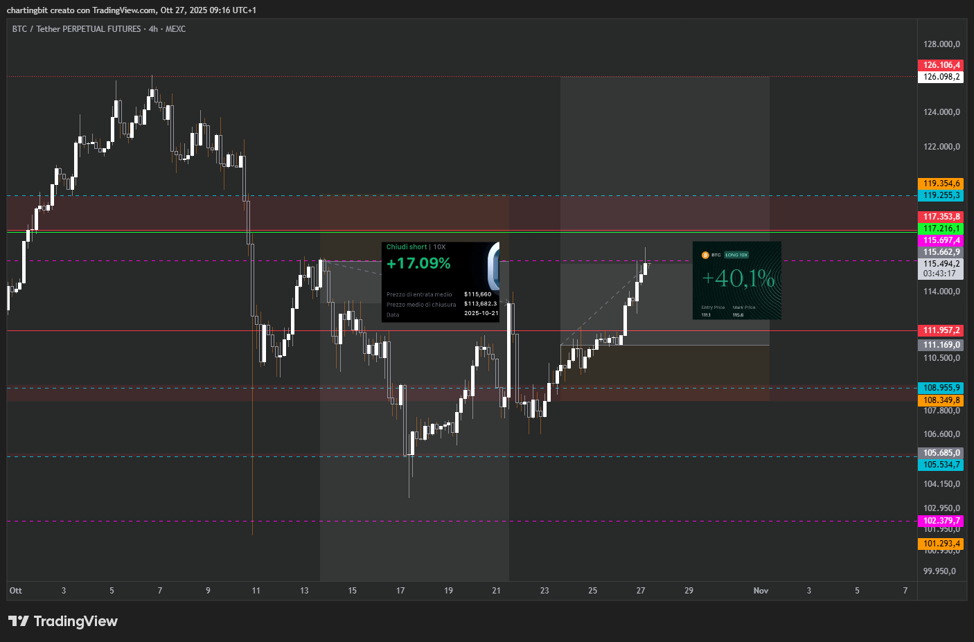 Di fatti la mossa a rialzo è stata invalidata violentemente subito dopo, con Bitcoin che è andato a chiudere il micro gap per poi recuperare ancora una volta, in questa circostanza ho allora deciso di espormi long a 111k, con target principali i 115.6 e i 117.2k, livelli che come sai ho indicato come cruciali per una vera conferma di nuovi ATH per Bitcoin.