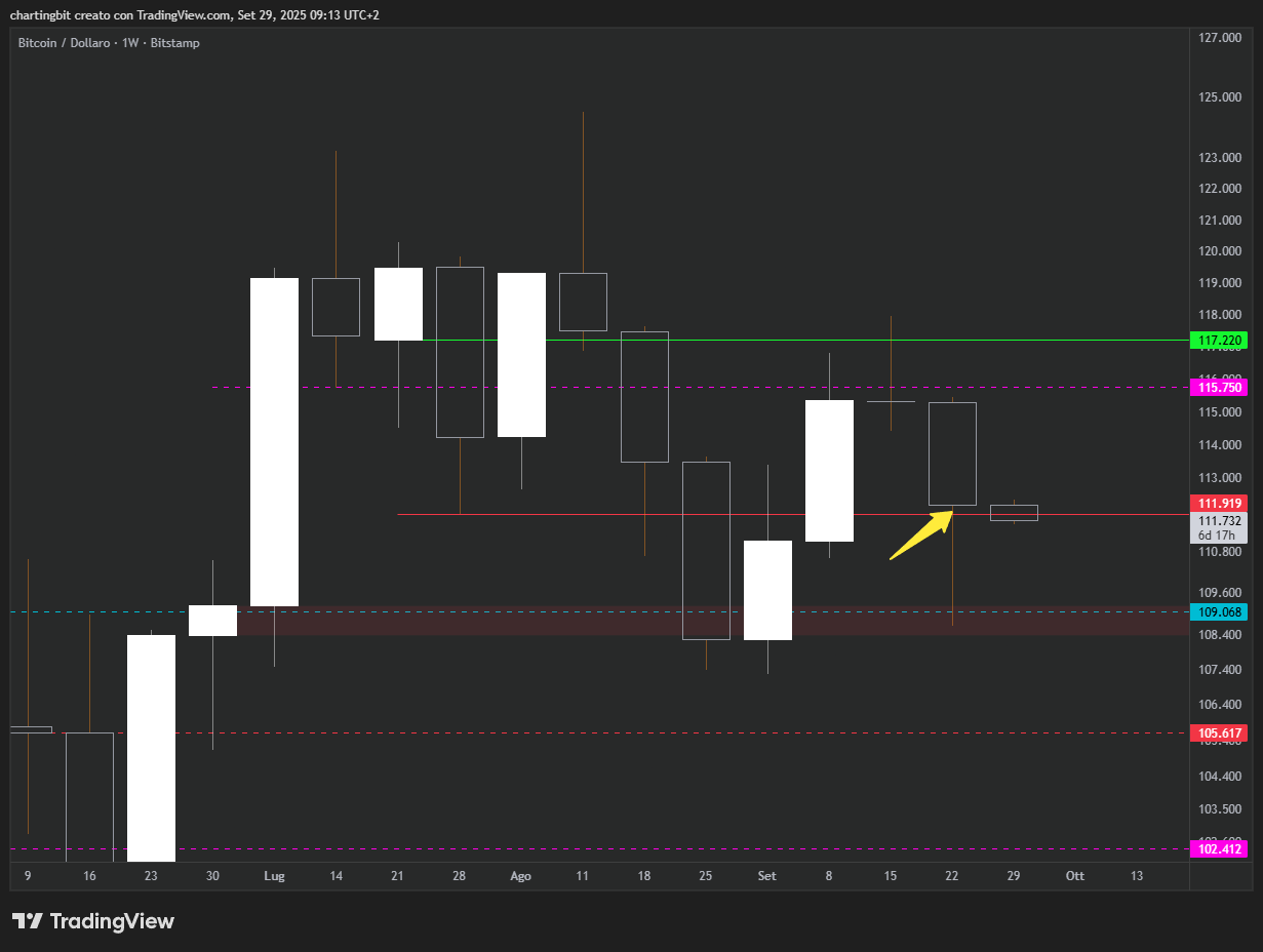 Fino a ieri pomeriggio Bitcoin stava infatti per chiudere la settimanale sotto il livello chiave dei 111.9k, segnale che, come già sai, sarebbe stato importante per poter prediligere una direzione -in questo caso a ribasso- con più chiarezza, tuttavia un rimbalzo “improvviso” ha fatto sì che la chiusura avvenisse guarda caso poco al di sopra dei 111.9k