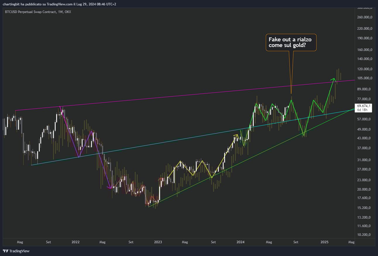 Questo ragionamento è dovuto ad un’analisi che ho condiviso a metà giugno, in cui ti mostravo come Bitcoin stesse copiando mossa dopo mossa il pattern dell’Oro dal lontano 2021 ad oggi.
