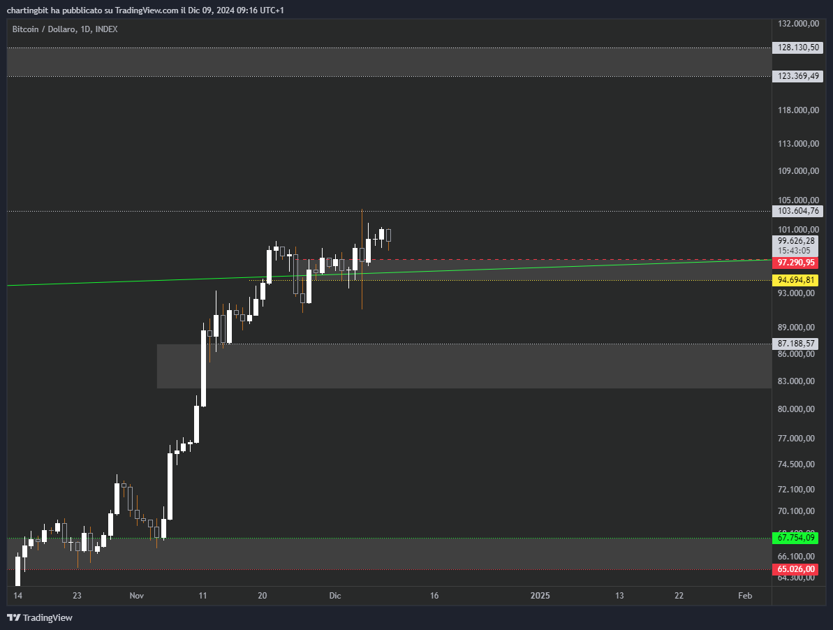 Nello specifico, se dovesse iniziare a muoversi sotti i 97.3k nel daily e portarsi sotto i 94.7k allora questa volta almeno gli 87k sarebbero davvero molto probabili, mentre se dovesse tornare sopra i 103.6k il prossimo target diventerebbero i 123.4
