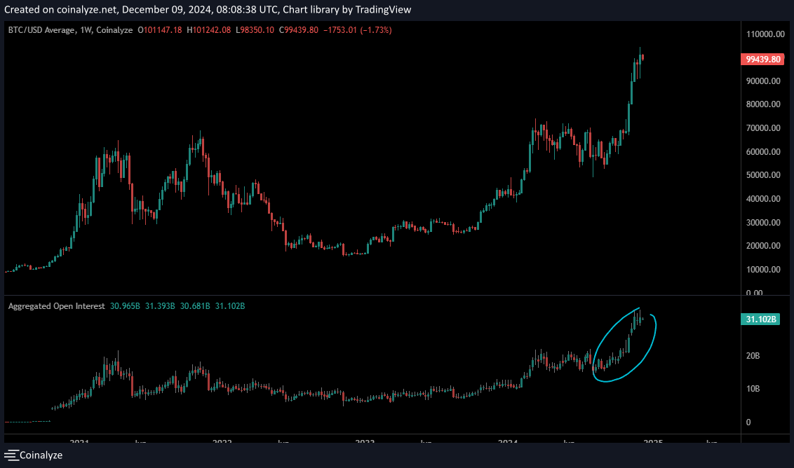 C’è da dire che durante tutta la durata del mio short sono stato pagato, e nemmeno poco, questo è normale in un bull-market esteso ma è anche indice che il mercato sia estremamente over-leveraged, come facilmente riscontrabile dando uno sguardo all’open interest, che solo in questa ultima leg-up dai 60k in su è dupplicato andando ovviamente ad ATH e producendo il rialzo HTF più importante di sempre: