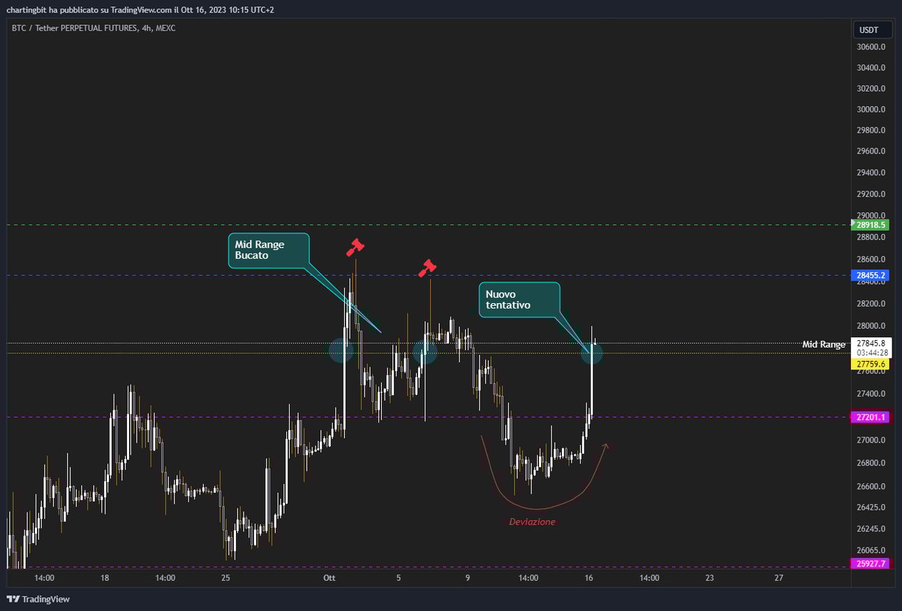 Se non ci fosse l’importantissimo livello di resistenza a 28.9k sarei già entrato long proprio adesso con target il range high a $31000, infatti puoi vedere come il prezzo stia tentando di riconquistare il mid range a $27759 e al momento sembra ci stia anche riuscendo.