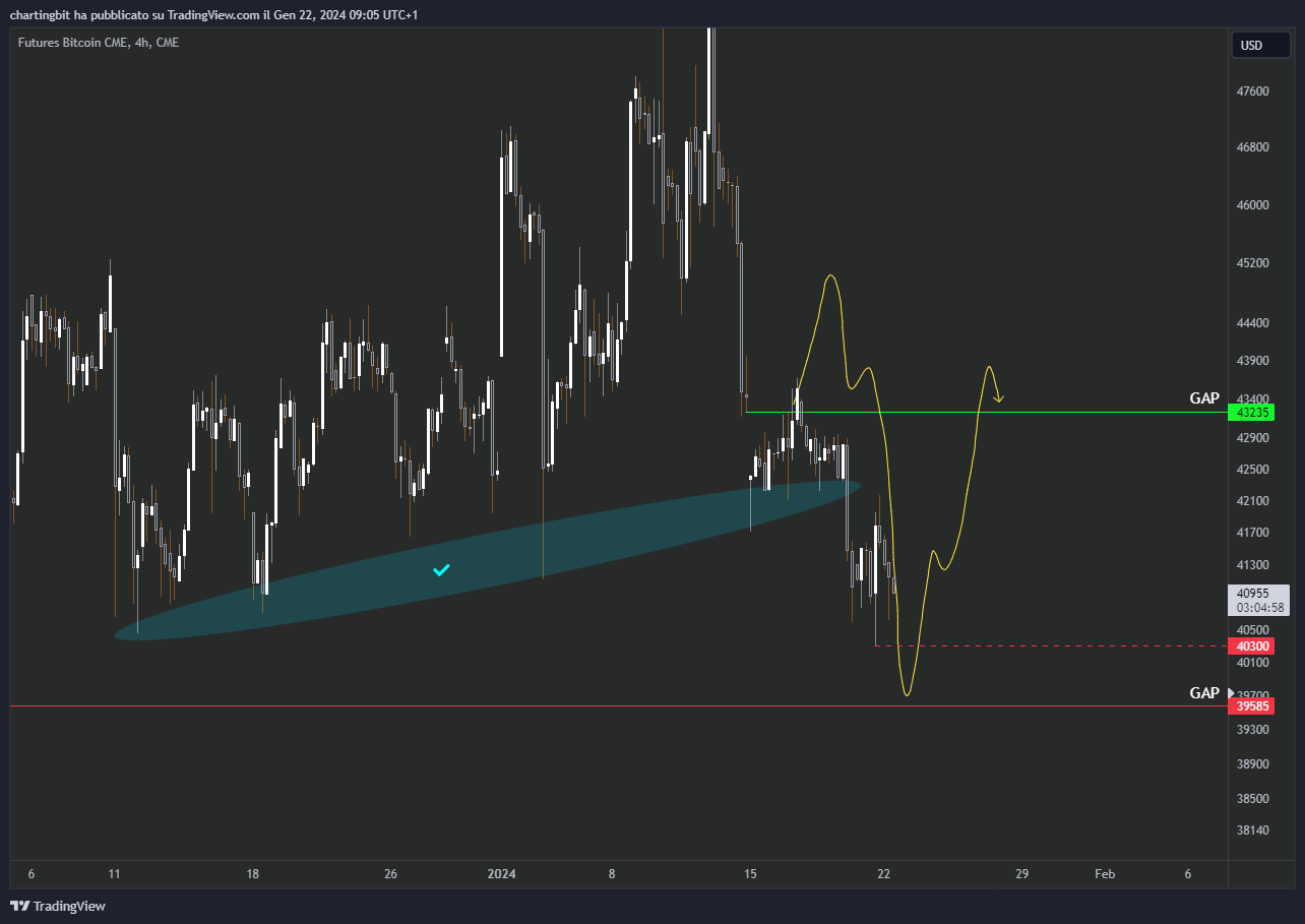 Come mi auspicavo la settimana scorsa il prezzo, dopo aver chiuso il gap a $43165, ha continuato a scendere sfiorando l’estremo superiore del gap a $39585, e nonostante un po’ di indecisione (che nei LTF ha confuso anche me) credo che si stia lentamente dirigendo proprio lì e a breve verrà chiuso.